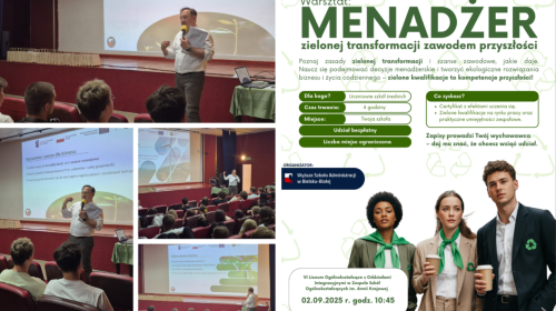 2 września 2025 roku wzięli udział w specjalistycznych warsztatach poświęconych zielonej transformacji i zrównoważonemu rozwojowi, zorganizowanych w ramach projektu UE „Rozwój na rzecz zielonej gospodarki...”. Szczególny nacisk położono na rozwój kompetencji związanych z zawodem przyszłości – Menadżera zielonej transformacji. W kolejnych tygodniach uczniowie uczestniczyli w zajęciach terenowych w Dolinie Wapienicy, warsztatach w Zakładzie Gospodarki Odpadami w Bielsku-Białej oraz w wycieczce dydaktycznej do oczyszczalni ścieków w Komorowicach (AQUA S.A.), poznając nowoczesne rozwiązania z zakresu ochrony środowiska. Dodatkowo, 19 września aktywnie włączyli się w ogólnopolską akcję "Sprzątanie świata – Polska 2025", porządkując tereny zielone wokół szkoły i promując postawy proekologiczne.
