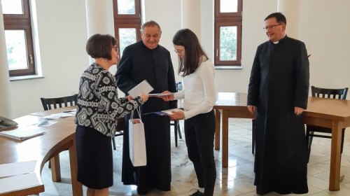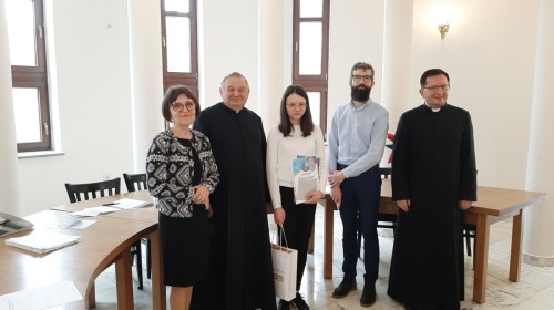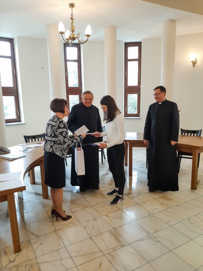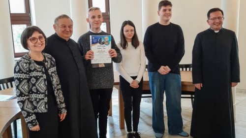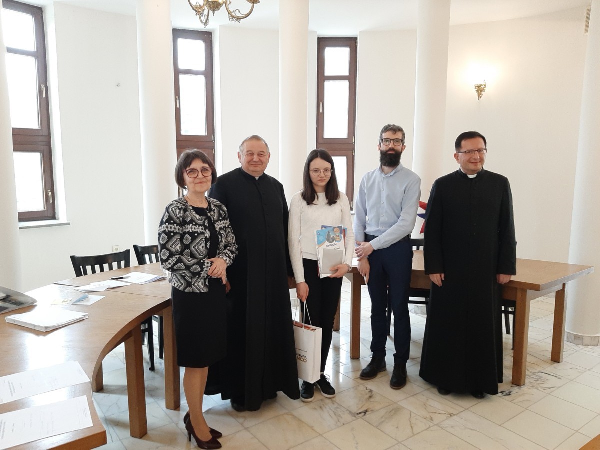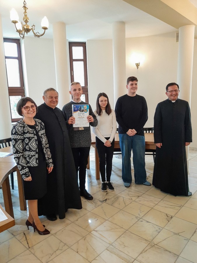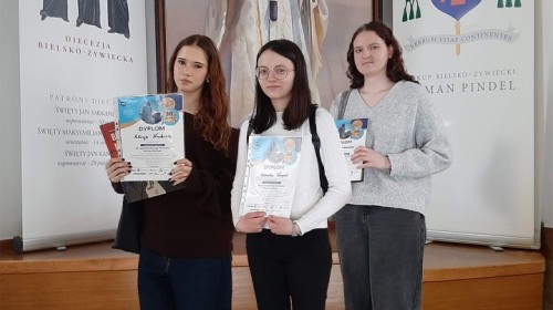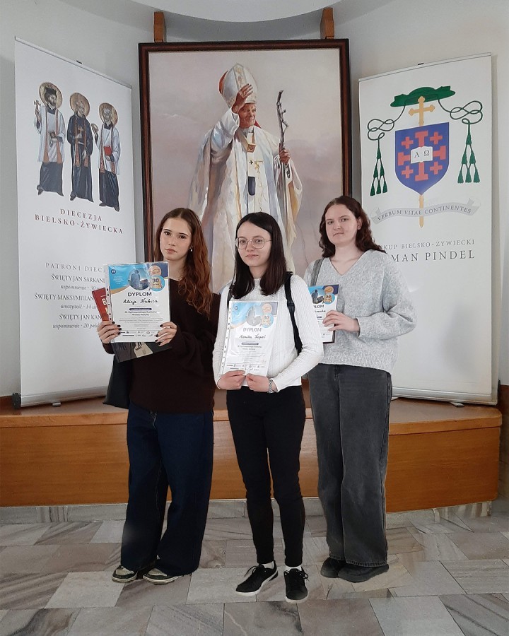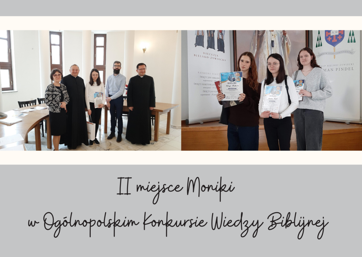 15 kwietnia 2026 r., nasza szkoła wzięła udział w etapie diecezjalnym jubileuszowej, 30. edycji Ogólnopolskiego Konkursu Wiedzy Biblijnej, organizowanego przez Katolickie Stowarzyszenie „Civitas Christiana”. Naszą szkołę reprezentowały trzy uczennice: Monika Kopeć, Zuzanna Rokowska oraz Alicja Kubica. W tym roku zakres merytoryczny był wyjątkowo obszerny i obejmował znajomość Księgi Estery, Księgi Mądrości oraz Ewangelii według św. Mateusza (wraz z przypisami, wstępami i słownikiem). Walka o miejsca na podium była niezwykle zacięta, a poziom wiedzy uczestników z całej diecezji – bardzo wysoki. Zmagania konkursowe podzielone były na dwa etapy: pisemny i ustny. Poziom trudności pytań testowych był bardzo wysoki, tym większa jest nasza radość z faktu, że Monika Kopeć z doskonałym wynikiem awansowała do finałowej siódemki etapu diecezjalnego. W części ustnej finaliści odpowiadali na pytania przed komisją konkursową. Monika wykazała się nie tylko imponującą wiedzą, ale i opanowaniem. O ostatecznych wynikach na podium musiała zadecydować dogrywka, po której nasza uczennica zajęła zaszczytne 2. miejsce! Dzięki temu wspaniałemu wynikowi, Monika Kopeć wywalczyła awans do Ogólnopolskiego Finału OKWB, który odbędzie się w dniach 10-12 czerwca w Warszawie. Wszystkim naszym reprezentantkom serdecznie gratulujemy ogromnej wiedzy i włożonego wysiłku w przygotowania, a Monice życzymy powodzenia na szczeblu ogólnopolskim. Trzymamy kciuki, a przede wszystkim pamiętamy w modlitwie.