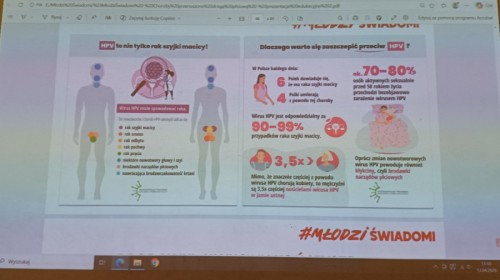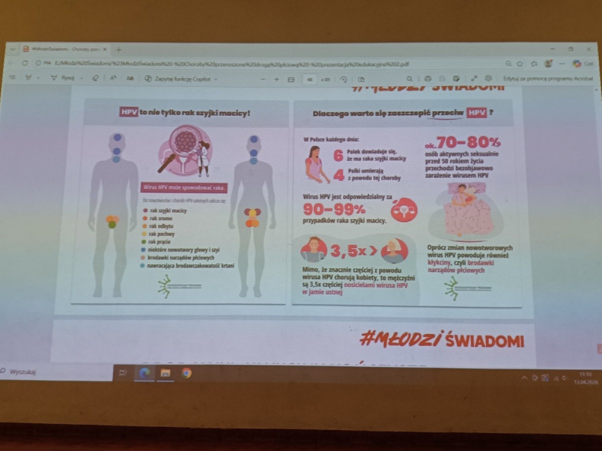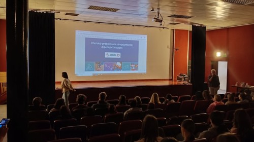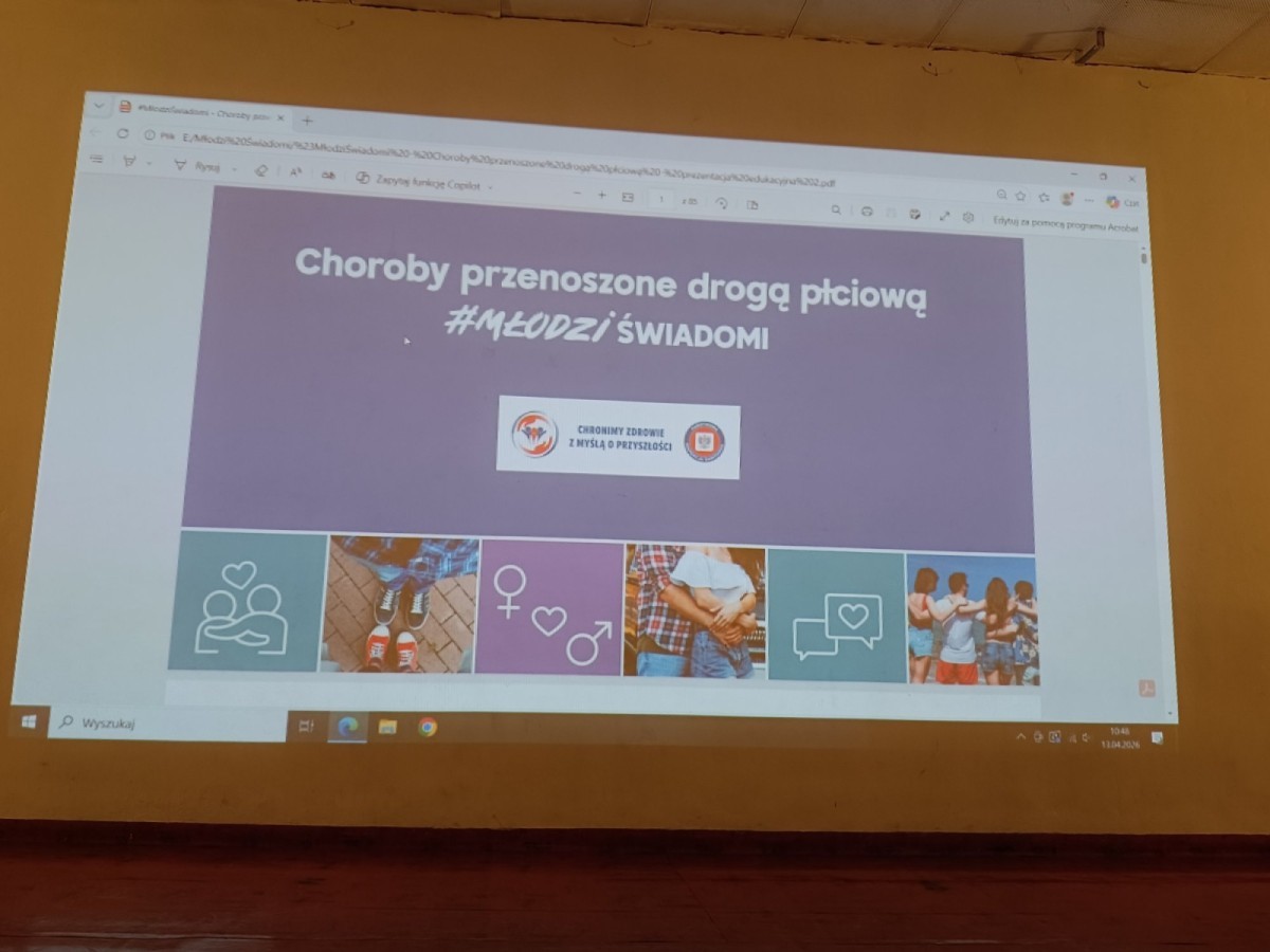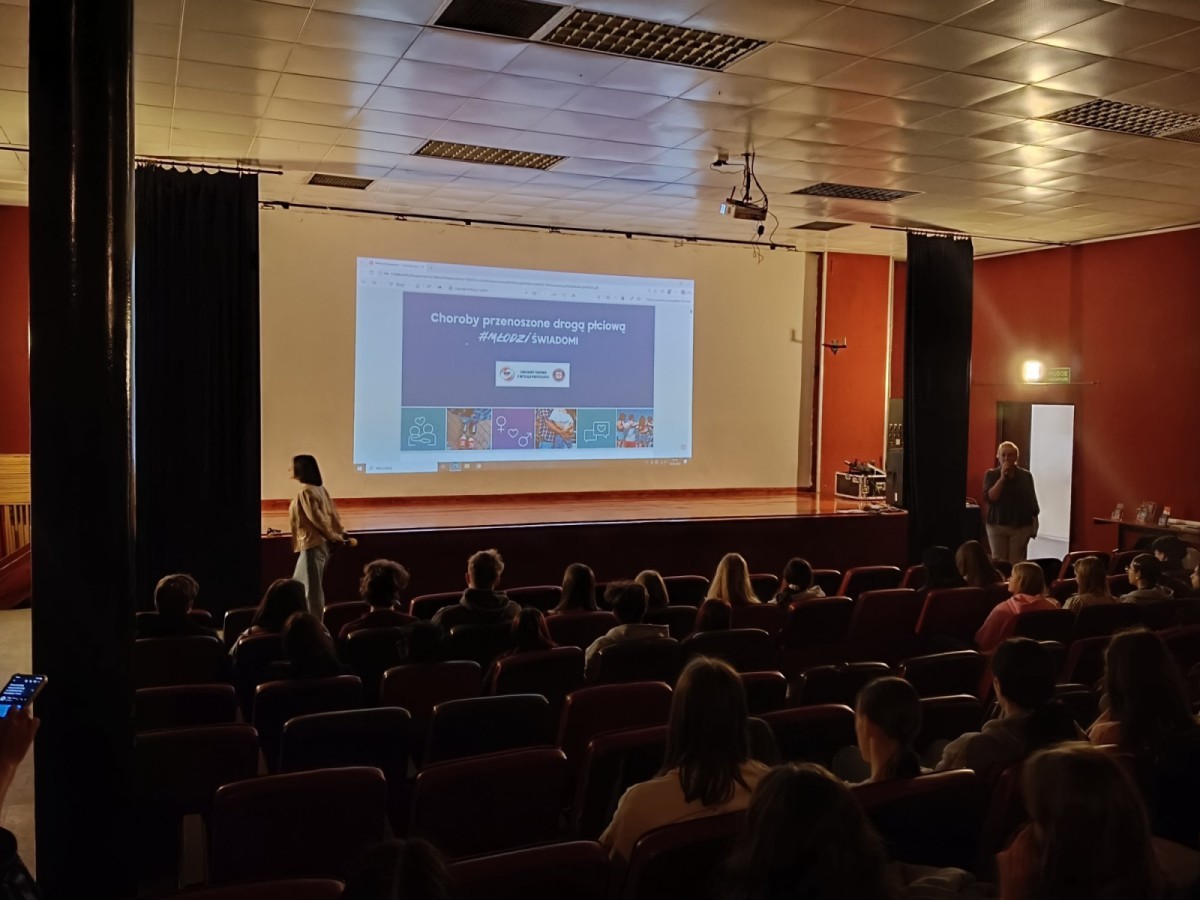 W dniu 13.04.2026 uczniowie i uczennice klas trzecich naszego liceum wzięli udział w prelekcji na temat „Choroby przenoszone drogą płciową”, zorganizowanej w ramach kampanii #MŁODZI/ŚWIADOMI. Została ona przeprowadzona przez pracownice bielskiej Stacji Sanitarno-Epidemiologicznej. Pani wykładowczyni zapoznała młodzież z rodzajami drobnoustrojów wywołujących choroby, sposobami zakażenia oraz objawami infekcji, a także przedstawiła wskazówki, jak się chronić przed tego typu chorobami. Zaprezentowano również dane statystyczne dotyczące najczęściej występujących schorzeń. Na zakończenie wskazano dostępne źródła wiedzy.