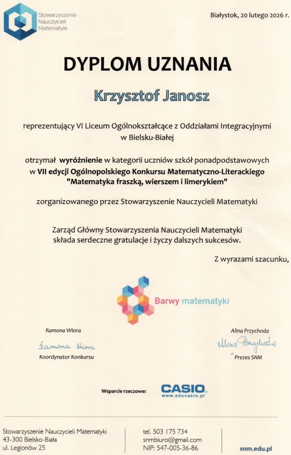 Z wielką radością informujemy, że uczeń naszej szkoły, Krzysztof Janosz z klasy 3bL, odniósł sukces w VII Edycji Ogólnopolskiego Konkursu Matematyczno-Literackiego „Matematyka fraszką, wierszem i limerykiem”. Krzysztof otrzymał wyróżnienie w kategorii szkół ponadpodstawowych. Konkurs, organizowany przez Stowarzyszenie Nauczycieli Matematyki, wymagał od uczestników nie tylko sprawności językowej, ale i błyskotliwego, matematycznego spojrzenia na świat. Za swoją kreatywną twórczość nasz uczeń został uhonorowany nagrodą rzeczową. Serdecznie gratulujemy Krzysztofowi talentu oraz umiejętności łączenia nauk ścisłych z literaturą. Życzymy dalszych sukcesów i nieustającej weny!