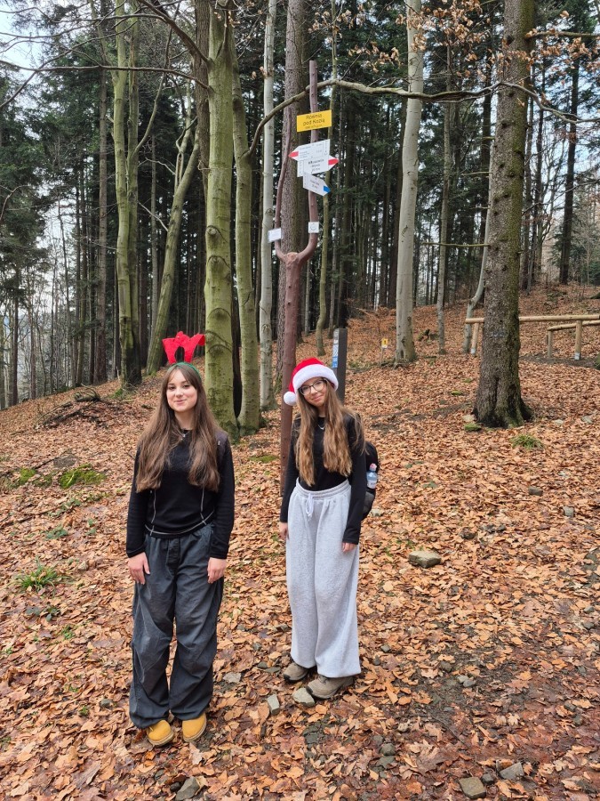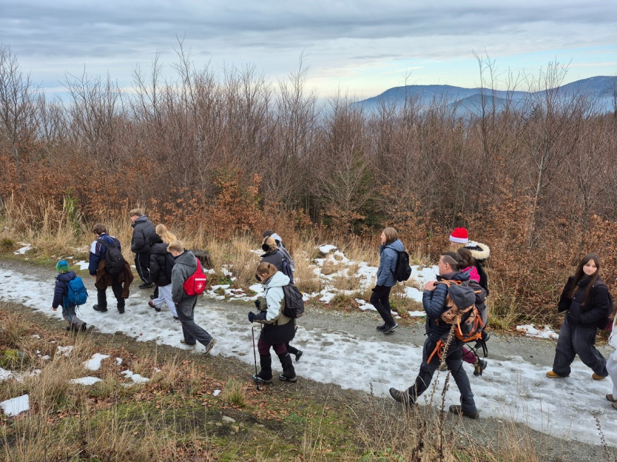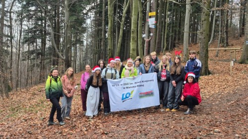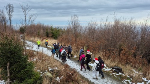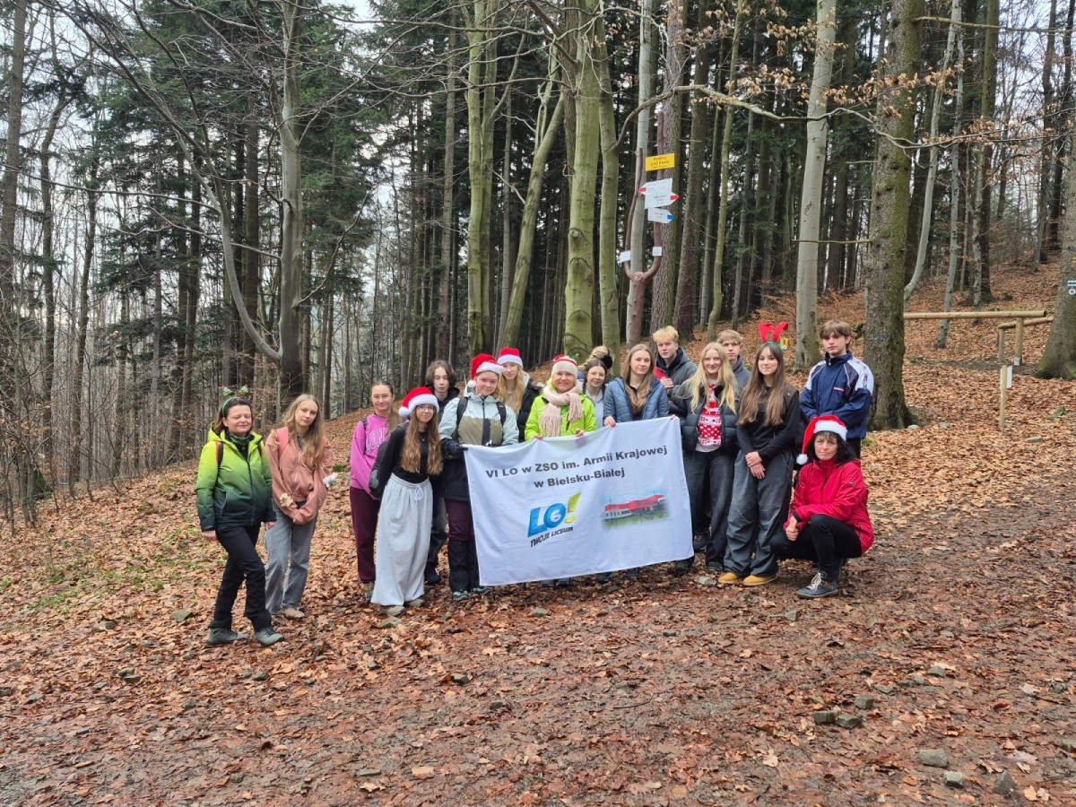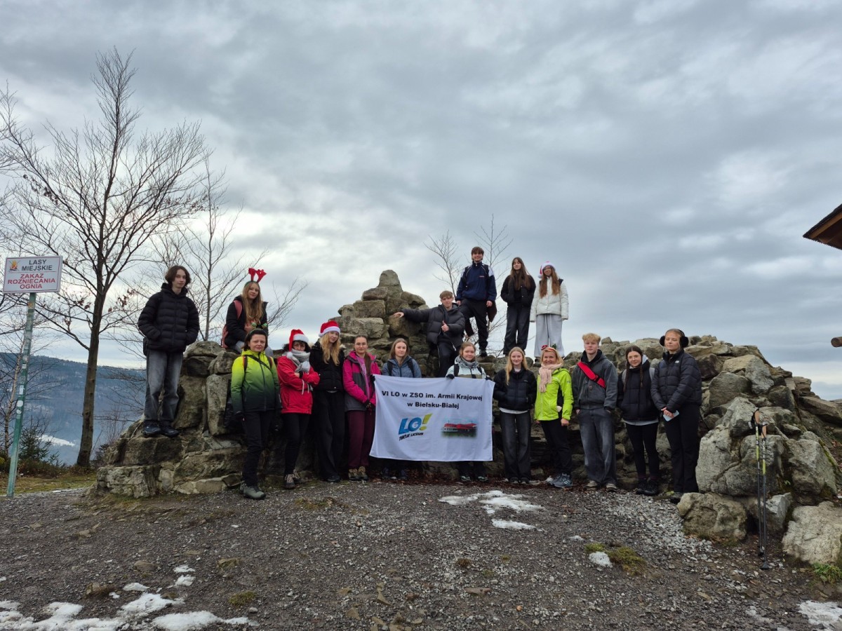 6. grudnia to doskonała okazja, aby kontynuować nasze wyzwanie "40 szczytów na 40-lecie szkoły". Dlatego też, w odpowiednich strojach i nakryciach głowy, z samego rana, gromadnie wyruszyliśmy czerwonym szlakiem na Kozią Górę. Udało się-kolejny szczyt zdobyty! I to w jakim stylu! Na utrudzonych wędrowców na górze czekało już ognisko-doskonała okazja, aby udoskonalić umiejętności pieczenia kiełbasek. Jeszcze tylko pamiątkowe zdjęcie z nieodzowną flagą VI LO i wyruszyliśmy w powrotną drogę. Zaraz, zaraz-a skąd się tu wzięły dwa bałwanki?