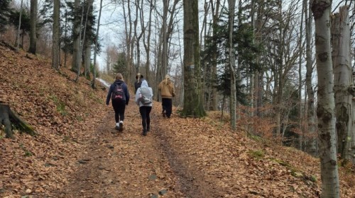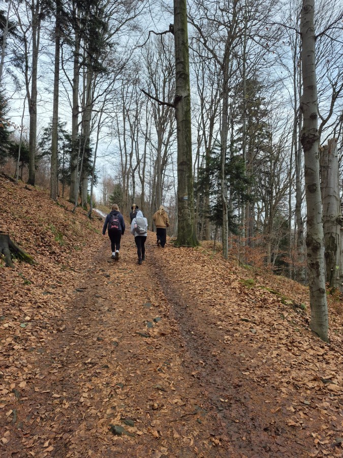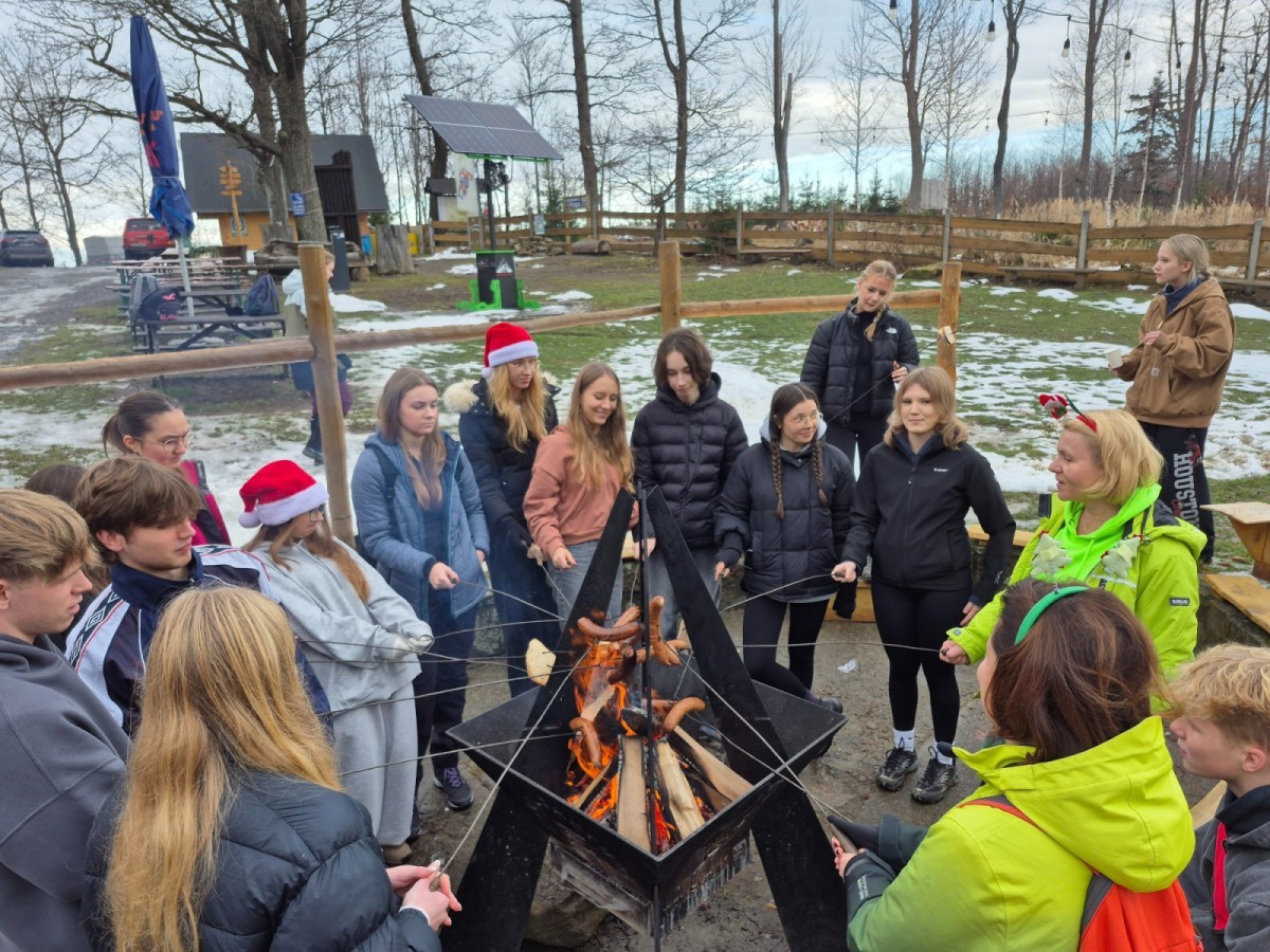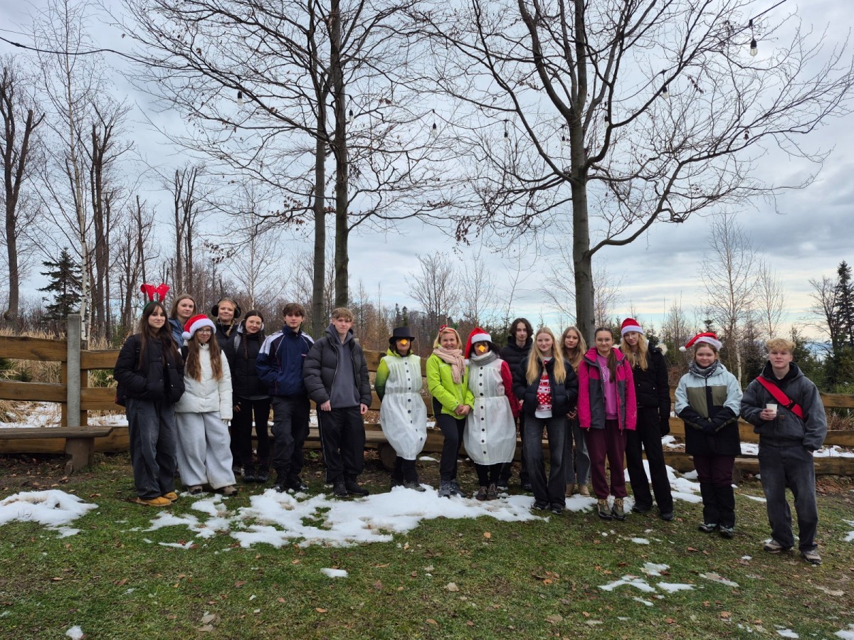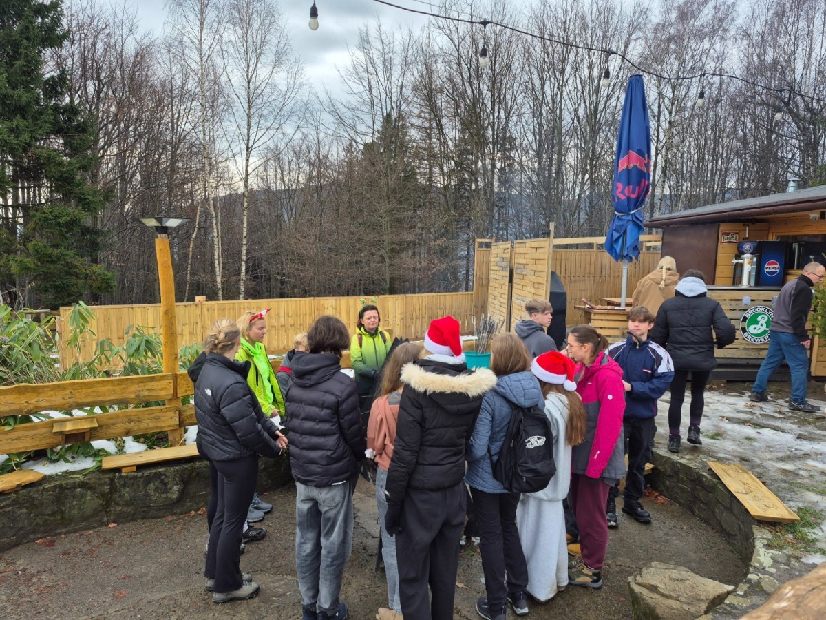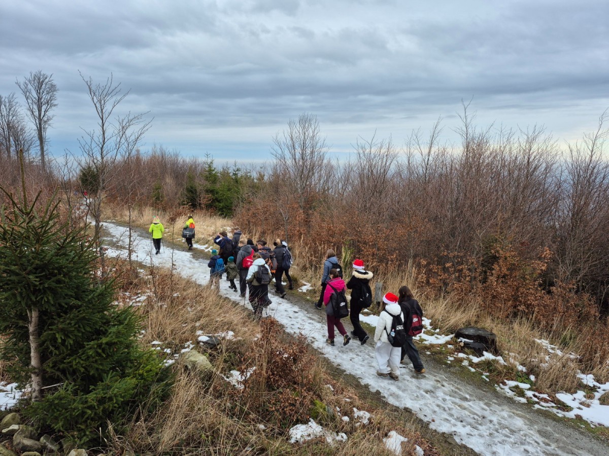 6. grudnia to doskonała okazja, aby kontynuować nasze wyzwanie "40 szczytów na 40-lecie szkoły". Dlatego też, w odpowiednich strojach i nakryciach głowy, z samego rana, gromadnie wyruszyliśmy czerwonym szlakiem na Kozią Górę. Udało się-kolejny szczyt zdobyty! I to w jakim stylu! Na utrudzonych wędrowców na górze czekało już ognisko-doskonała okazja, aby udoskonalić umiejętności pieczenia kiełbasek. Jeszcze tylko pamiątkowe zdjęcie z nieodzowną flagą VI LO i wyruszyliśmy w powrotną drogę. Zaraz, zaraz-a skąd się tu wzięły dwa bałwanki?