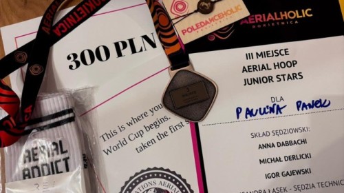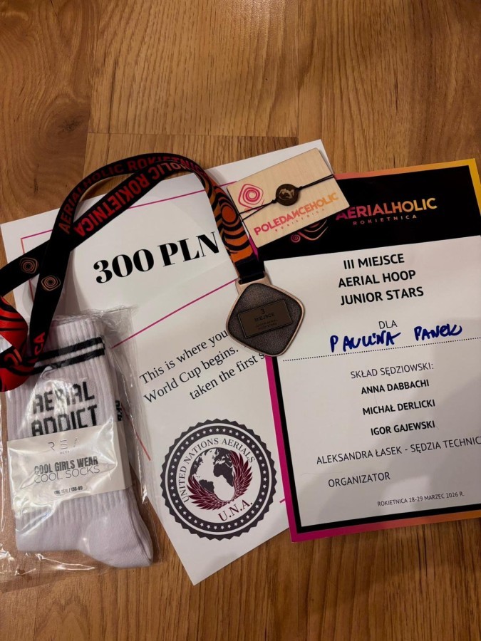 W miniony weekend, 28-29 marca, Rokietnica stała się stolicą akrobatyki powietrznej podczas zawodów Aerialholic 2026. Wydarzenie to zgromadziło artystów rywalizujących w dyscyplinach Aerial Hoop (koło), Aerial Silks (szarfy) oraz Flying Pole. Mamy ogromną radość ogłosić, że Paulina Panek, uczennica naszej klasy sportowej 4dL oraz reprezentantka bielskiego klubu GOjump, wywalczyła 3. miejsce w kategorii Junior Aerial Hoop Stars! Sukces ten jest wynikiem ciężkiej pracy Pauliny pod okiem jej trenera, Igora Gajewskiego. Oprócz miejsca na podium, nasza zawodniczka zdobyła nagrodę pieniężną oraz oficjalną kwalifikację na Puchar Świata U.N.A. we Włoszech! Jesteśmy niesamowicie dumni z tak wysokiej formy i determinacji. Paulina, ogromne brawa dla Ciebie i Trenera! Trzymamy mocno kciuki za przygotowania do startu w Italii oraz – co równie ważne –życzymy Ci powodzenia na nadchodzącej maturze! Powodzenia na obu frontach!