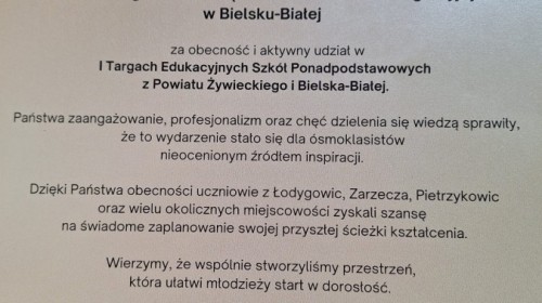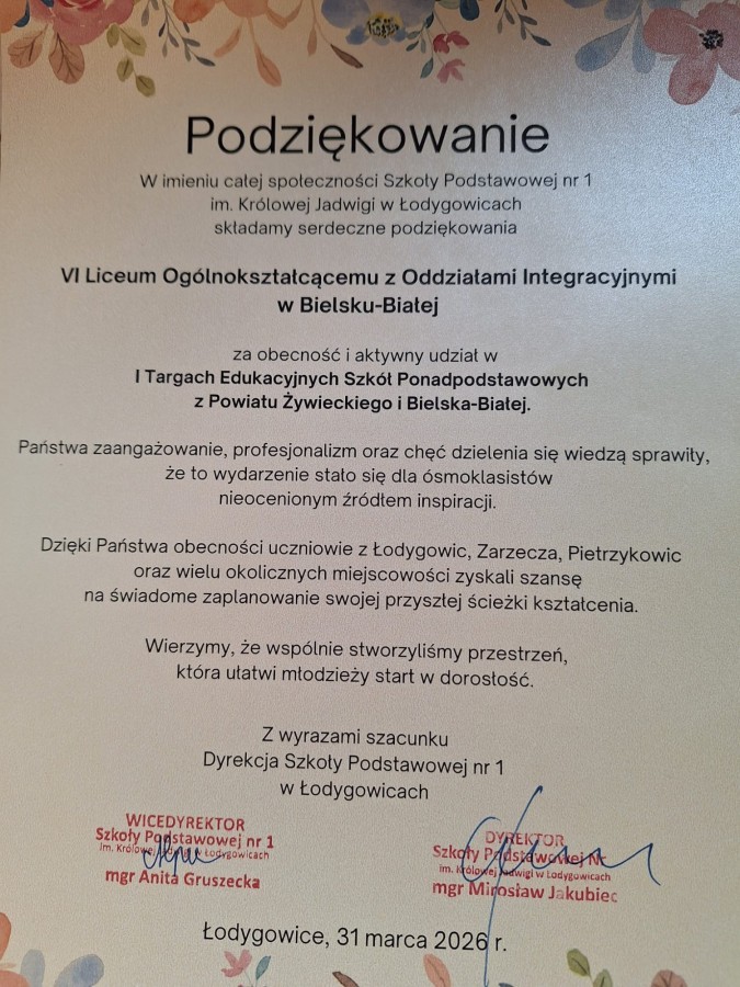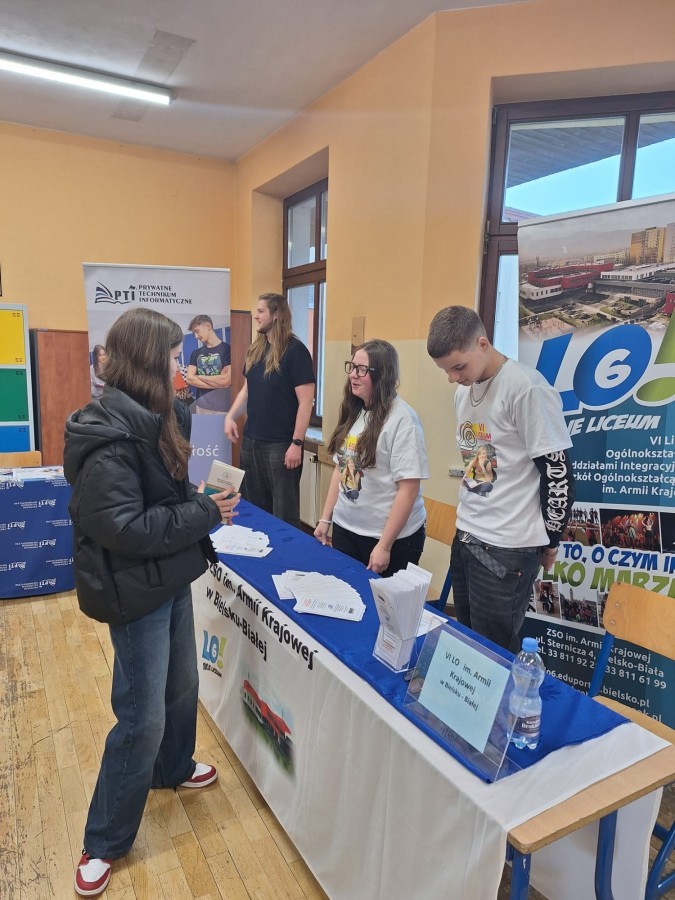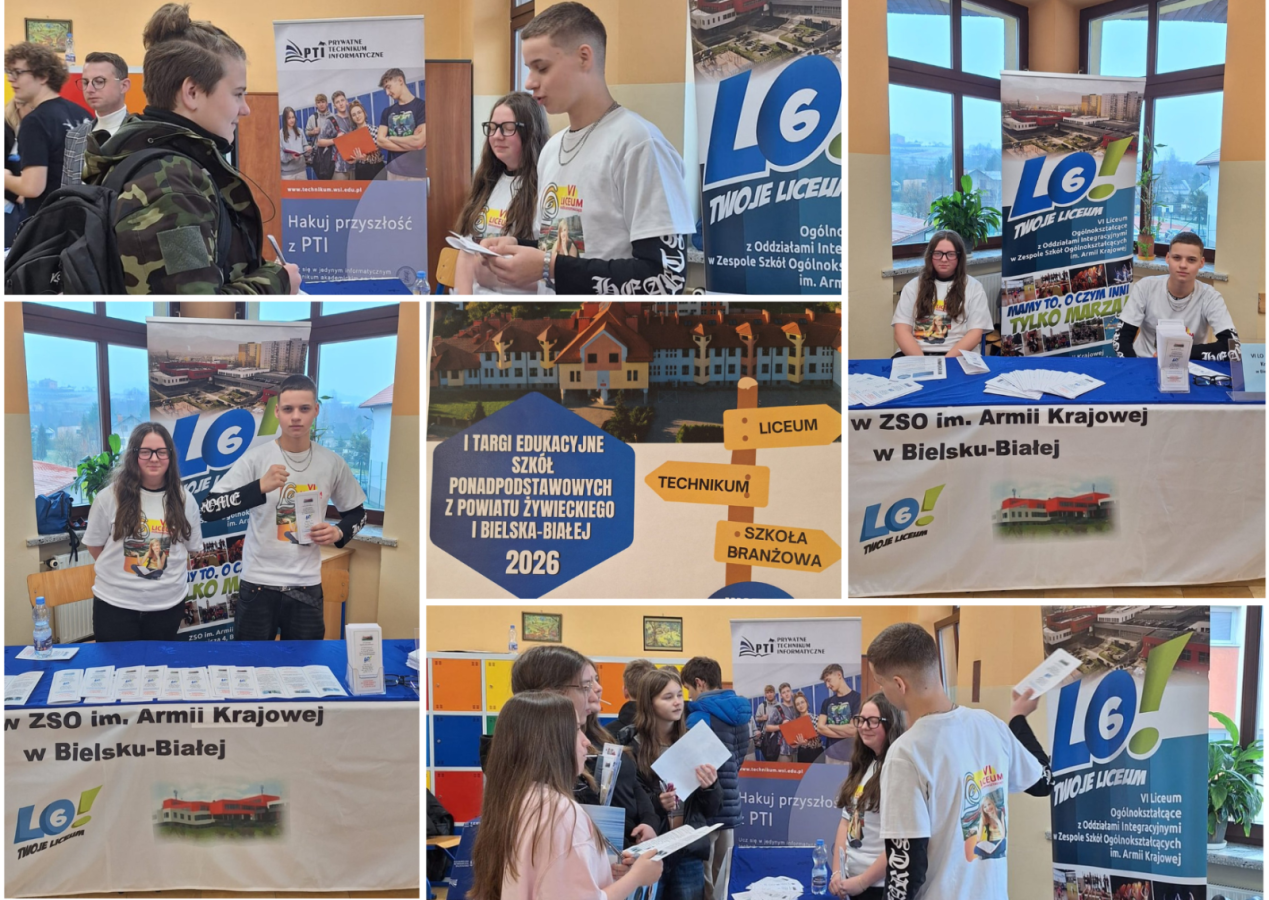 31 marca 2026 roku uczniowie VI Liceum Ogólnokształcącego z Oddziałami Integracyjnymi mieli wyjątkową okazję uczestniczyć w I Targach Edukacyjnych Szkół Ponadpodstawowych z Powiatu Żywieckiego i Bielska-Białej. Wydarzenie umożliwiło młodzieży zapoznanie się z szeroką ofertą szkół i świadome zaplanowanie swojej dalszej ścieżki edukacyjnej. Podczas targów uczniowie aktywnie zdobywali informacje o kierunkach kształcenia, rozmawiali z przedstawicielami szkół i zadawali pytania dotyczące przyszłych możliwości nauki. Dzięki temu mogli lepiej przygotować się do wyboru dalszej drogi edukacyjnej i świadomie planować start w dorosłość. To spotkanie pokazało, jak ważne jest wspieranie młodzieży w odkrywaniu własnych pasji i zainteresowań oraz tworzenie przestrzeni, która inspiruje do podejmowania przemyślanych decyzji dotyczących przyszłości.