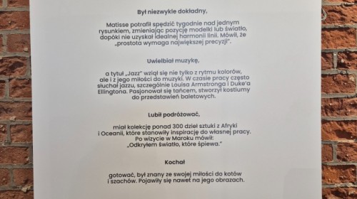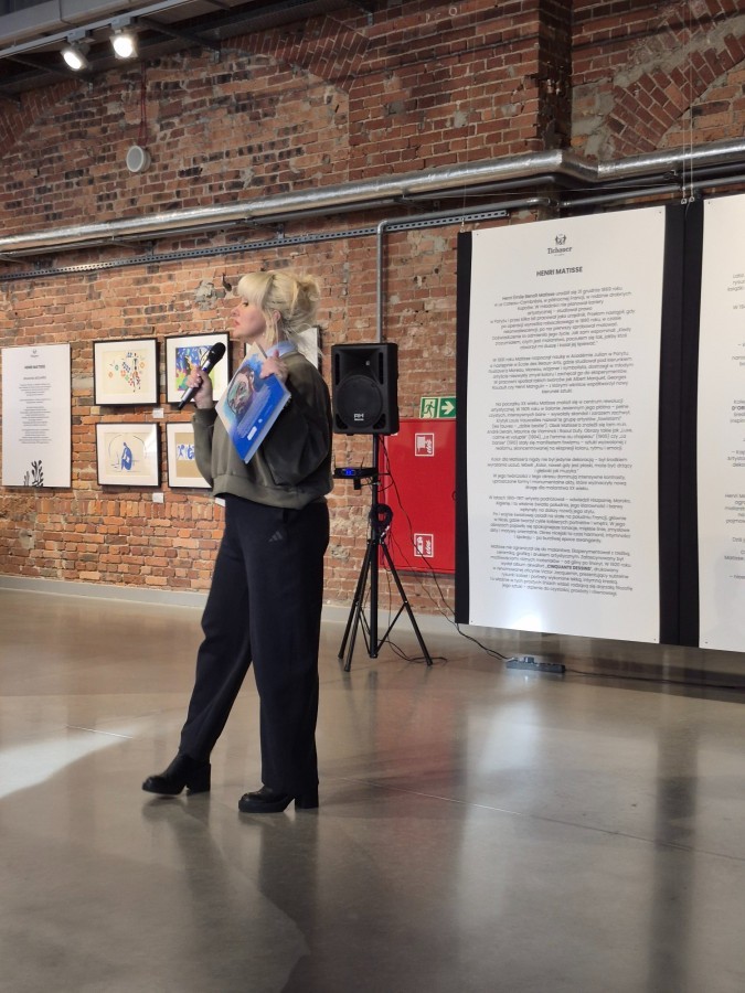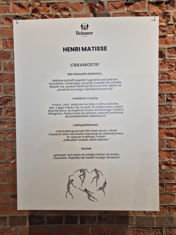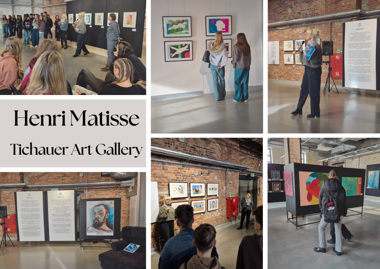 15 stycznia 2026 roku uczniowie klas 1aL i 1dL uczestniczyli w wycieczce edukacyjnej do Tichauer Art Gallery w Tychach, gdzie obejrzeli wystawę poświęconą twórczości Henri’ego Matisse’a – jednego z najwybitniejszych artystów XX wieku. Ekspozycja prezentowała dzieła powstałe w okresie pełnej dojrzałości twórczej artysty, ukazując jego indywidualną drogę artystyczną oraz nowatorski język wizualny oparty na uproszczeniu formy i intensywności koloru. Na wystawie zaprezentowano cykle litograficzne, kompozycje z wycinanek (gouaches découpées) oraz prace publikowane w książkach artystycznych autorstwa Matisse’a. Wyjazd był wyjątkową okazją do poznania twórczości artysty, który mimo trudnych doświadczeń życiowych i ograniczeń fizycznych stworzył dzieła do dziś inspirujące i zachwycające odbiorców na całym świecie.