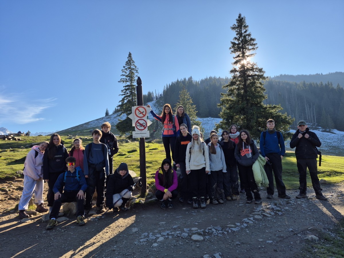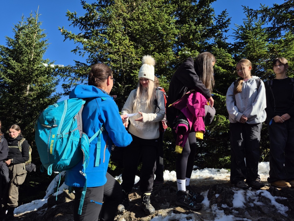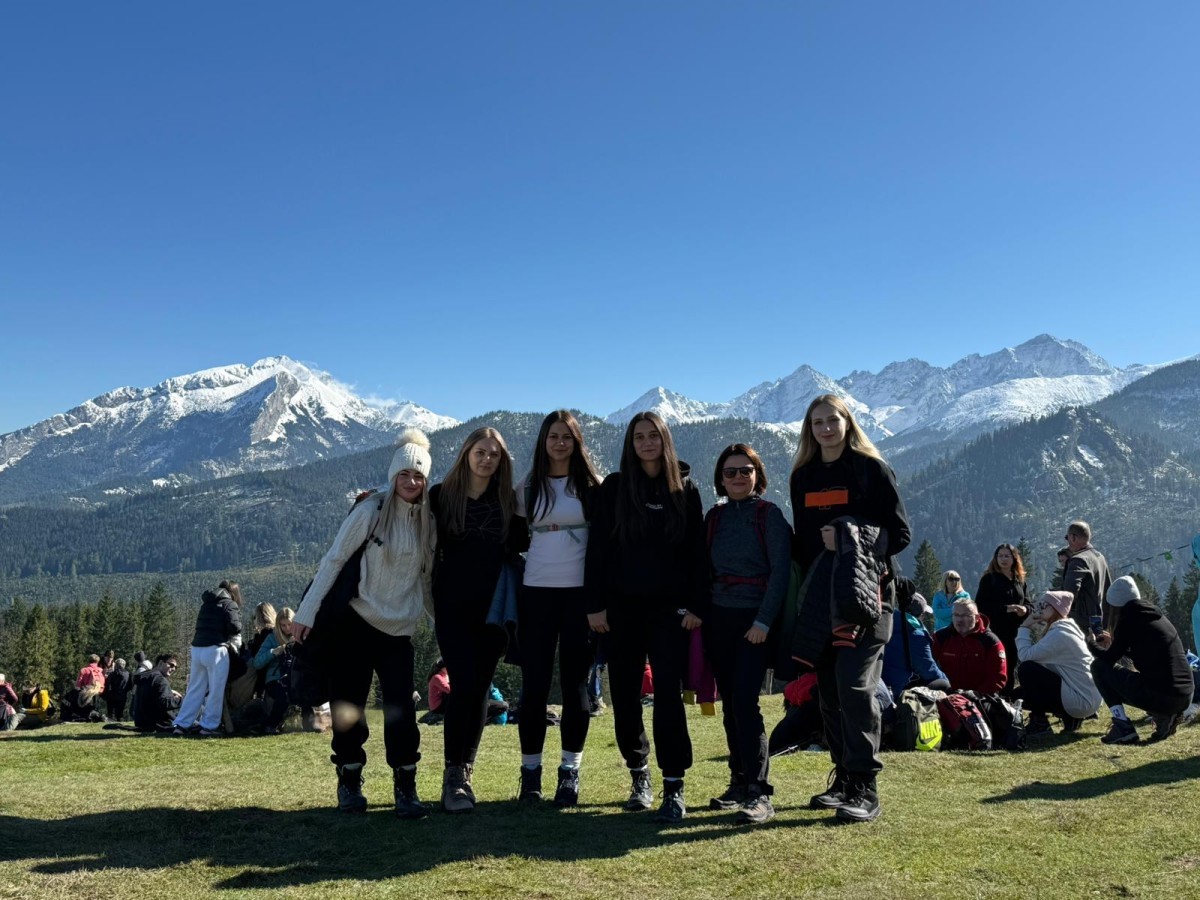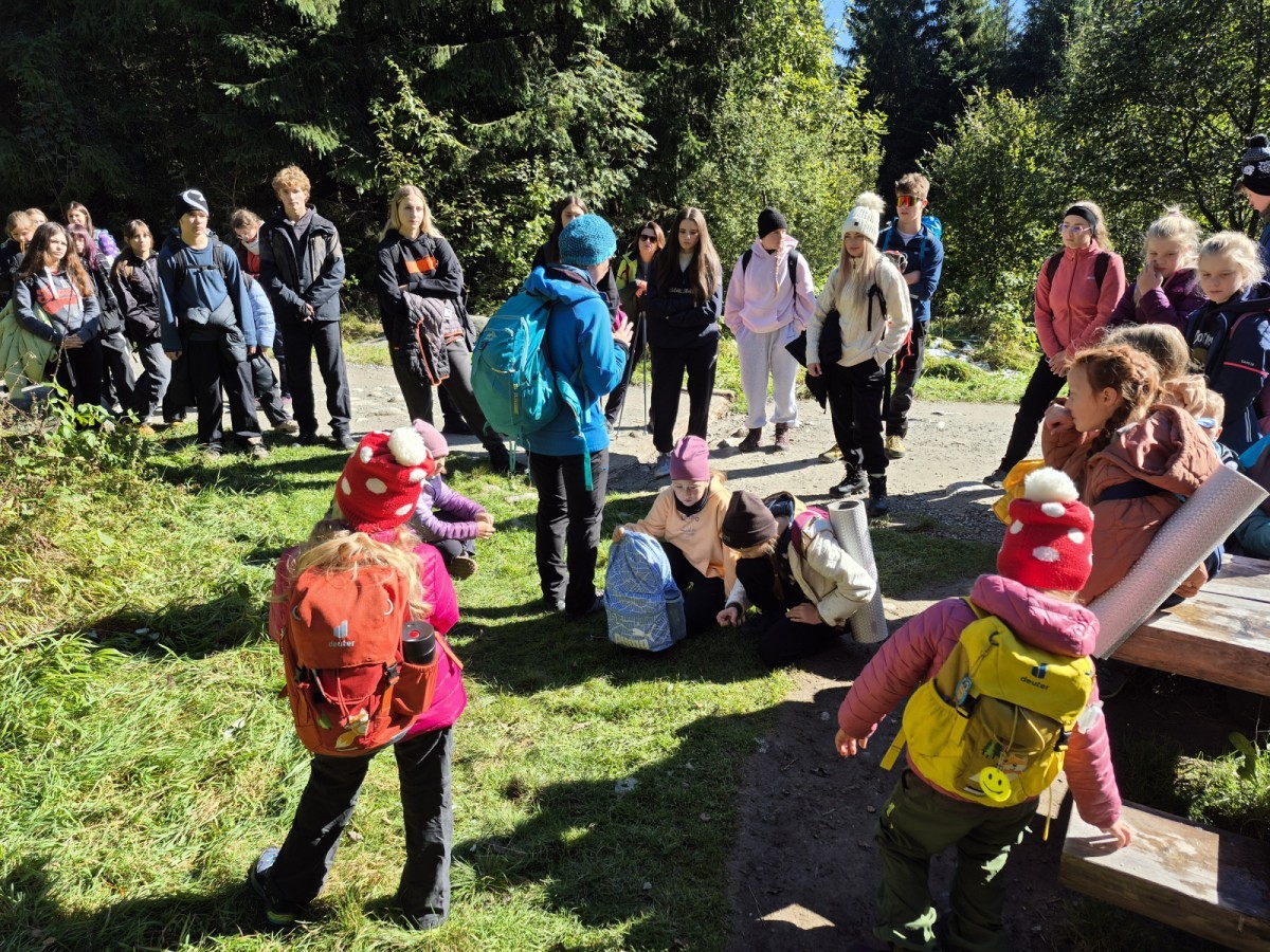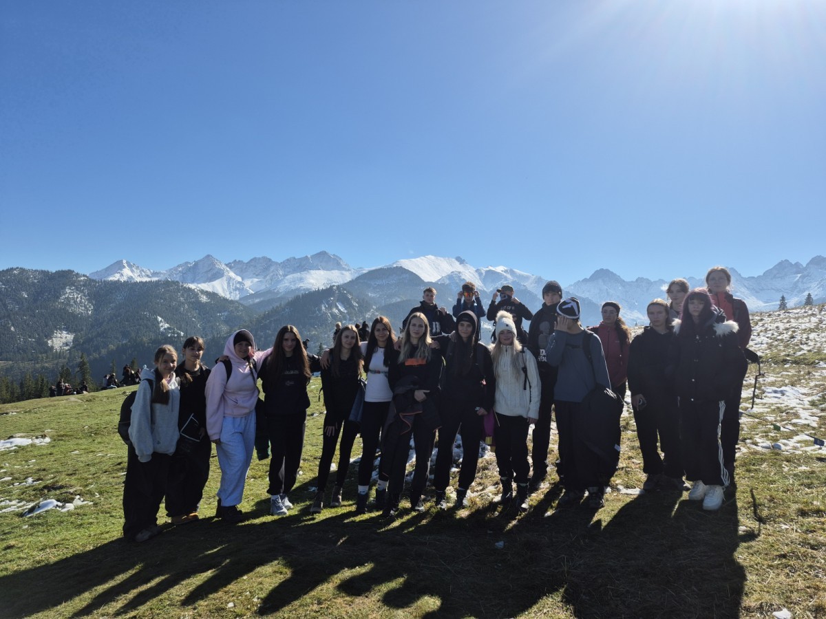4 października 2025 roku członkowie Szkolnego Koła Polskiego Towarzystwa Tatrzańskiego wyruszyli na swoją pierwszą wspólną wędrówkę po tatrzańskich szlakach. Piękna, słoneczna pogoda towarzyszyła nam przez cały dzień, co tylko spotęgowało radość z obcowania z górską przyrodą. Podczas postoju na Rusinowej Polanie mieliśmy okazję wysłuchać ciekawej opowieści naszej przewodniczki, pani Ani, na temat kulturowego wypasu owiec – tradycji głęboko zakorzenionej w historii Podhala. Kolejnym ważnym punktem wyprawy była Gęsia Szyja, z której roztacza się imponująca panorama Tatr Wysokich. To właśnie tam, na tle majestatycznych szczytów, pani Ania wręczyła uczestnikom legitymacje członkowskie Polskiego Towarzystwa Tatrzańskiego – symboliczne potwierdzenie przynależności do górskiej społeczności. Wyprawa była nie tylko doskonałą okazją do poznania tatrzańskiej przyrody, ale także inspirującym początkiem naszej wspólnej przygody z górami.