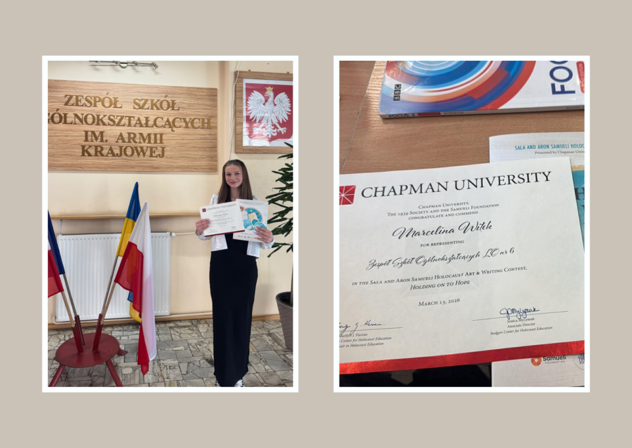 Z przyjemnością informujemy, że uczennica kl.1bL, Marcelina Witek, przygotowywana przez p. Agnieszkę Pollak-Olszowską, zdobyła wyróżnienie w międzynarodowym konkursie literacko-plastycznym Holocaust Art and Writing Contest, zorganizowanym przez Chapman University w USA .