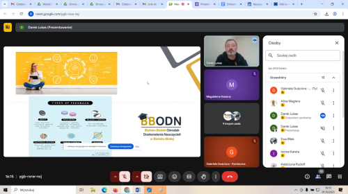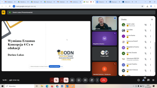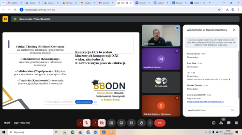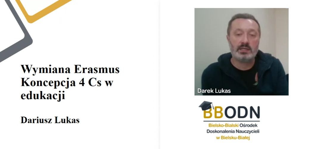 W dniu 1 października 2025 roku, w ramach działalności Bielsko-Bialskiego Ośrodka Doskonalenia Nauczycieli w Bielsku-Białej, odbyło się webinarium prowadzone przez mgr Dariusza Lukasa, poświęcone tematyce udziału w międzynarodowym kursie doskonalącym „4Cs – Communication, Collaboration, Creativity, Critical Thinking”, zrealizowanym w ramach programu Erasmus+.